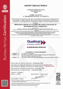Issue de la réforme de la formation professionnelle (5 septembre 2018) mise en place par le Ministère du travail, cette certification se base sur le Référentiel National Qualité – RNQ, soit 7 critères composés de 32 indicateurs. Autant de preuves attendues qui obligent à la mise en place d’une démarche de qualité globale. Entamée en janvier 2020, la démarche de certification actuellement en cours sera auditée à l’automne.